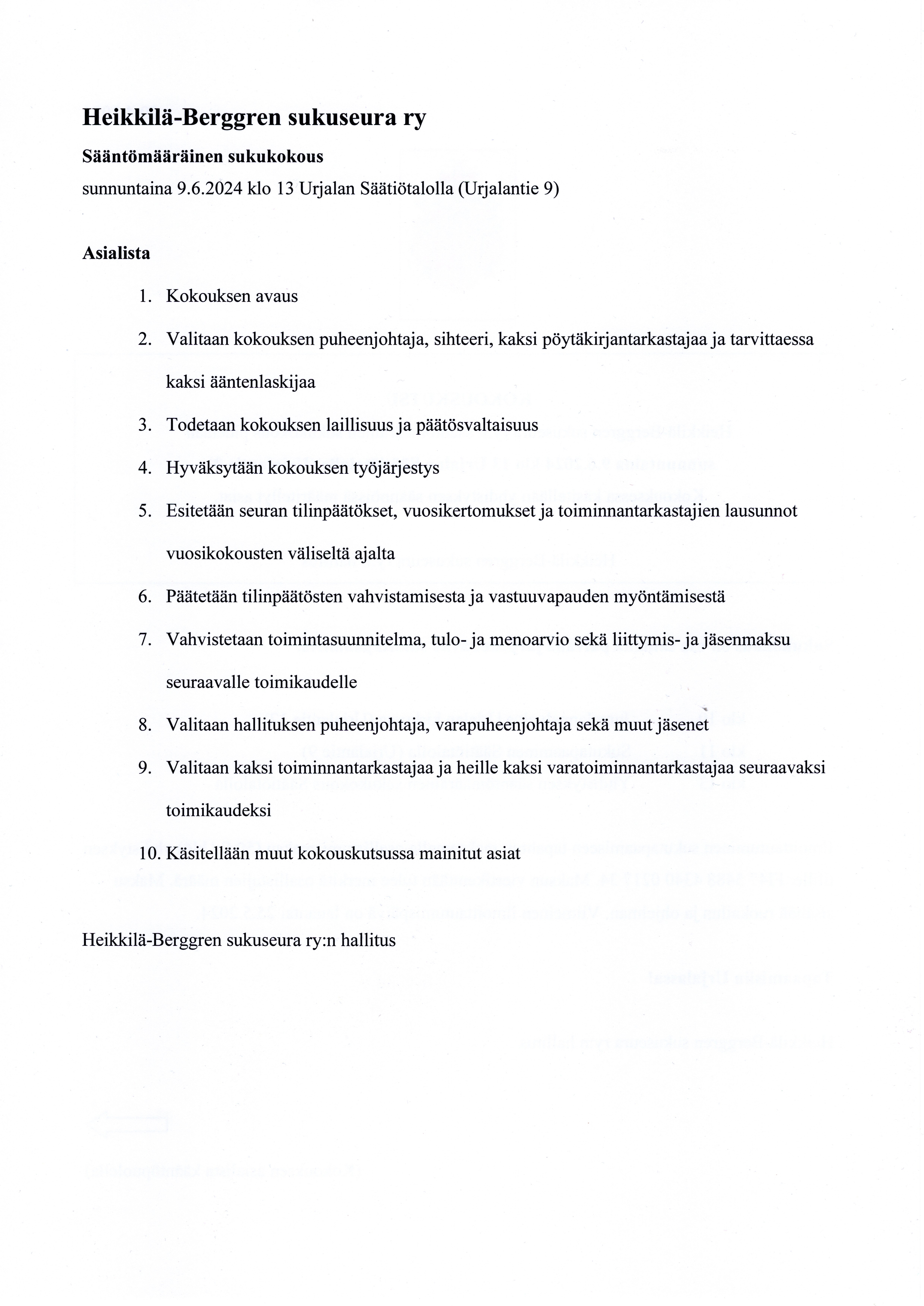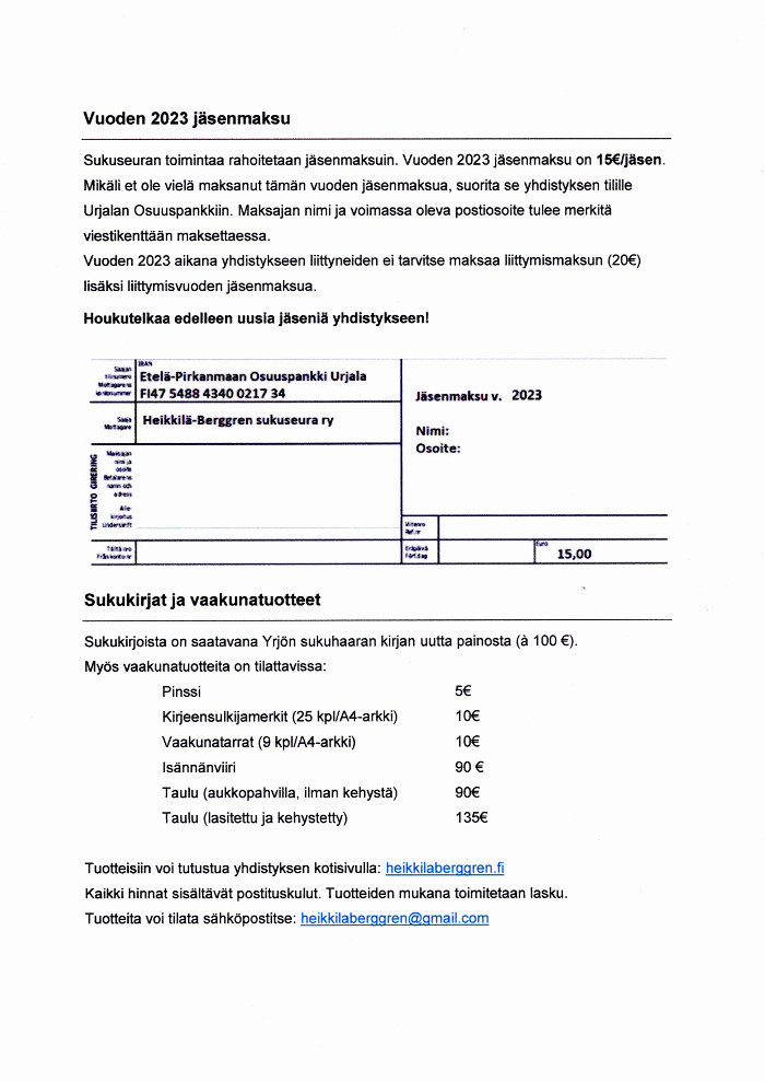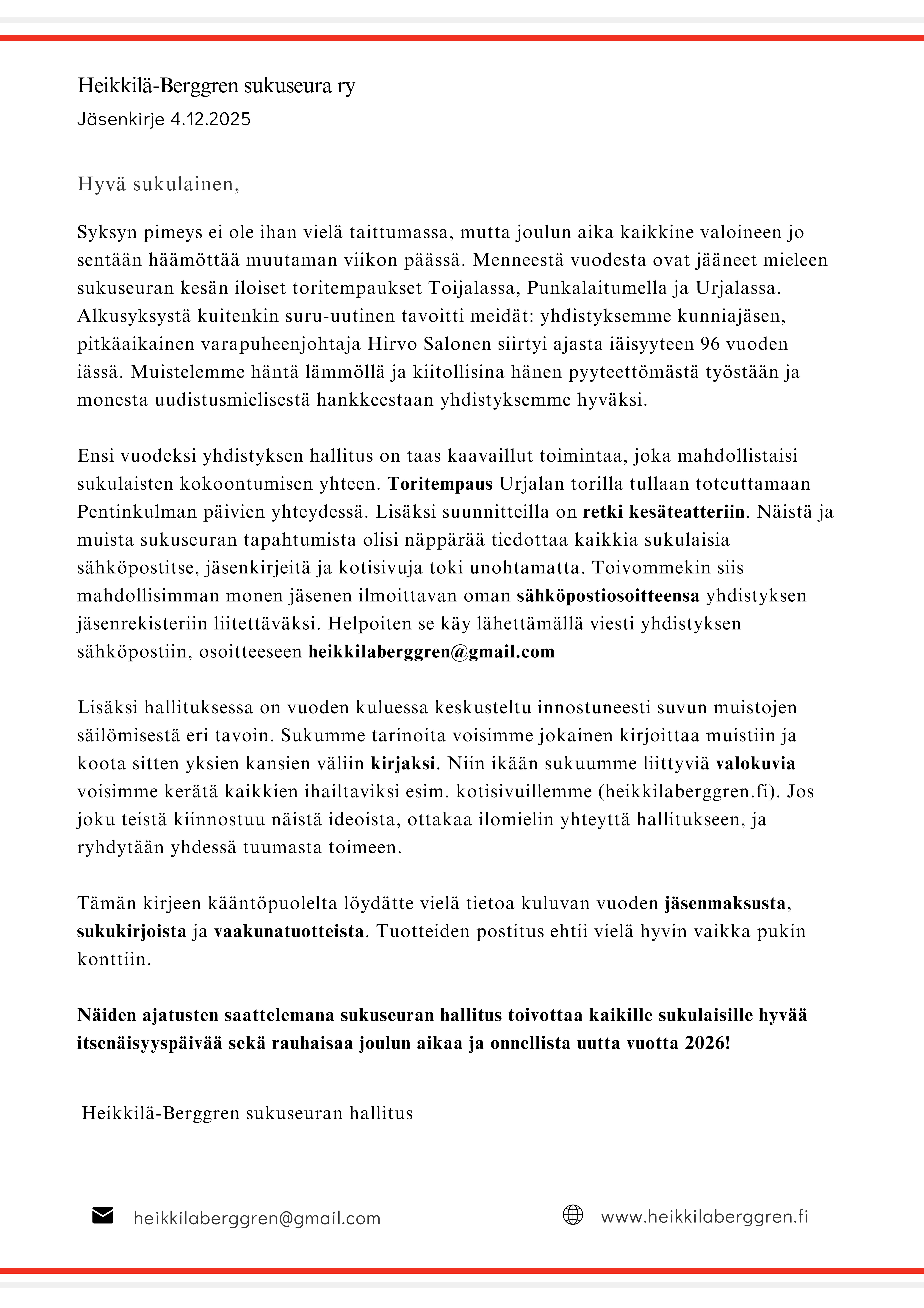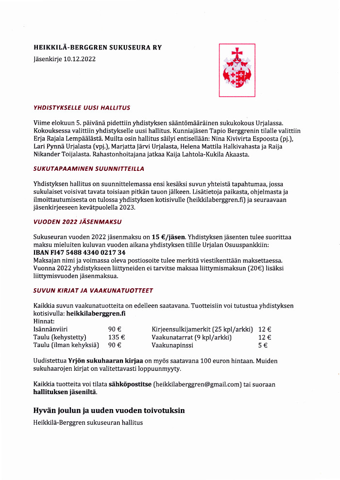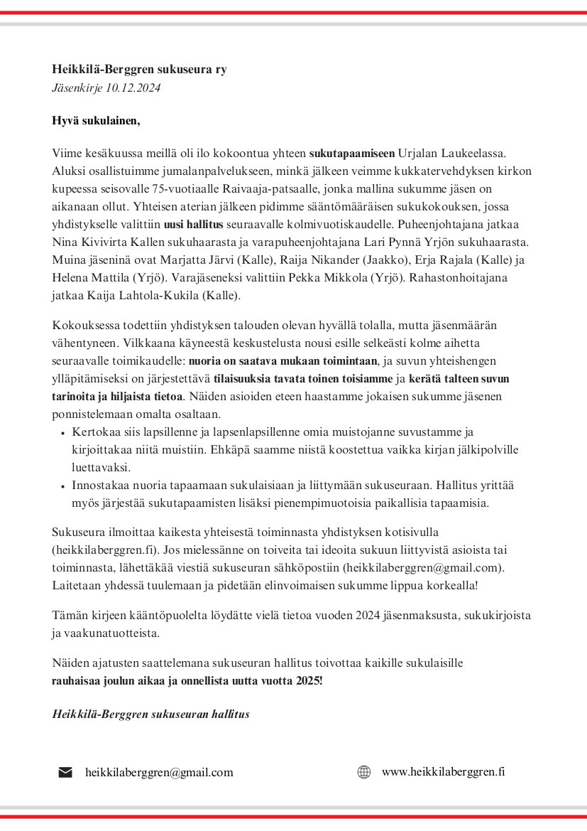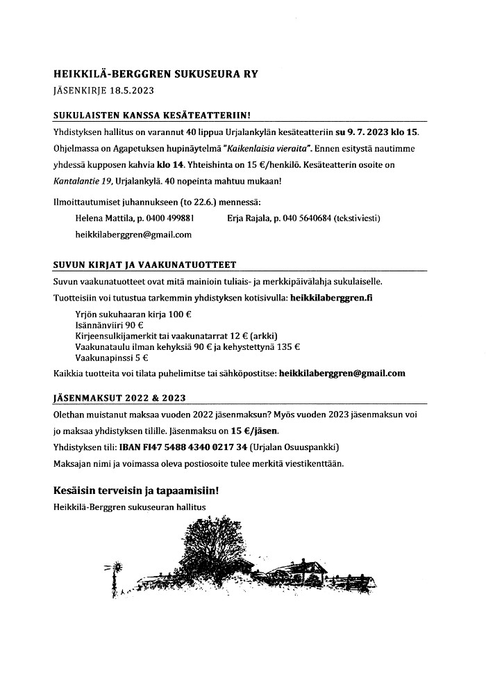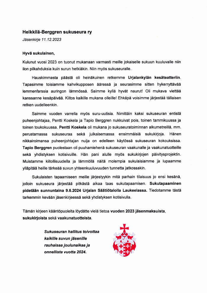 22.12.2025 Sukuseuran hallitus toivottaa kaikille sukulaisille Rauhallista joulunaikaa ja onnea tulevalle vuodelle 2026! 4.12.2025 Sukuseuran hallitus on lähettänyt yhdistyksen jäsenille jäsenkirjeen. Kirjeen voi lukea myös tässä: (sivu 1) ja (sivu 2). Mikäli et ole saanut kirjettä, vaikka olet yhdistyksen jäsen, vahvistathan osoitetietosi yhdistykselle sähköpostitse: heikkilaberggren(ät)gmail.com. Ilmoitathan myös sähköpostiosoitteesi yhdistykselle, niin voimme jatkossa tiedottaa muutoinkin kuin pelkän jäsenkirjeen välityksellä. 25.5.2025 Tule tapaamaan sukulaisia ja sukuseuraa kesätoreille! Olemme Toijalan markkinoilla pe-la 6.-7.6.2025, Punkalaitumen torilla to 31.7. ja Urjalan torilla pe 1.8. Pentinkulman päivillä. Paikan päällä voit liittyä jäseneksi yhdistykseen, päivittää osoitetietojasi tai muita tietoja, hankkia sukuseuran vaakunatuotteita tai tulla ihan vain vaihtamaan kuulumisia. Tapaamisiin! 22.12.2024 Sukuseuran hallitus toivottaa kaikille sukulaisille rauhallista joulua ja onnellista vuotta 2025! 10.12.2024 Sukuseuran hallitus on lähettänyt yhdistyksen jäsenille jäsenkirjeen. Kirjeen voi lukea myös tässä: (sivu 1) ja (sivu 2). Mikäli et ole saanut kirjettä, vaikka olet yhdistyksen jäsen, ilmoitathan muuttuneet yhteystietosi sähköpostitse: heikkilaberggren(ät)gmail.com 3.6.2024 KOKOUSPAIKKA VAIHTUNUT! Ilmoitamme, että sukutapaamisen ja -kokouksen paikka vaihtuu vähäisen osallistujamäärän takia. Säätiötalon sijaan tapaaminen järjestetään Urjalan Laukeelassa ravintola Pionissa (Tampereentie 4). Ohjelma ja aikataulu säilyvät samoina. Tervetuloa! 29.4.2024 KOKOUSKUTSU Heikkilä-Berggren sukuseura ry:n sääntömääräinen sukukokous pidetään sunnuntaina 9.6.2024 klo 13.00 Urjalan Säätiötalolla (Urjalantie 9). Kokouksessa käsitellään yhdistyksen säännöissä määritellyt asiat. Heikkilä-Berggren sukuseura ry:n hallitus 29.4.2024 Sukuseuran hallitus on lähettänyt yhdistyksen jäsenille kutsun sukutapaamiseen ja kokouskutsun sukukokoukseen jäsenkirjeessä. Kirjeen voi lukea myös tässä: (sivu 1) ja (sivu 2). Mikäli et ole saanut kirjettä, vaikka olet yhdistyksen jäsen, ilmoita muuttuneet yhteystietosi jäsenrekisteriin: heikkilaberggren(ät)gmail.com 11.12.2023 Sukuseuran hallitus on lähettänyt yhdistyksen jäsenille jäsenkirjeen. Kirjeen voi lukea myös tässä: (sivu 1) ja (sivu 2). 9.7.2023 Sukuseuran retki Urjalankylän kesäteatteriin. Vaihdoimme kuulumisia ja seurasimme Agapetuksen Kaikenlaisia vieraita -hupinäytelmää.