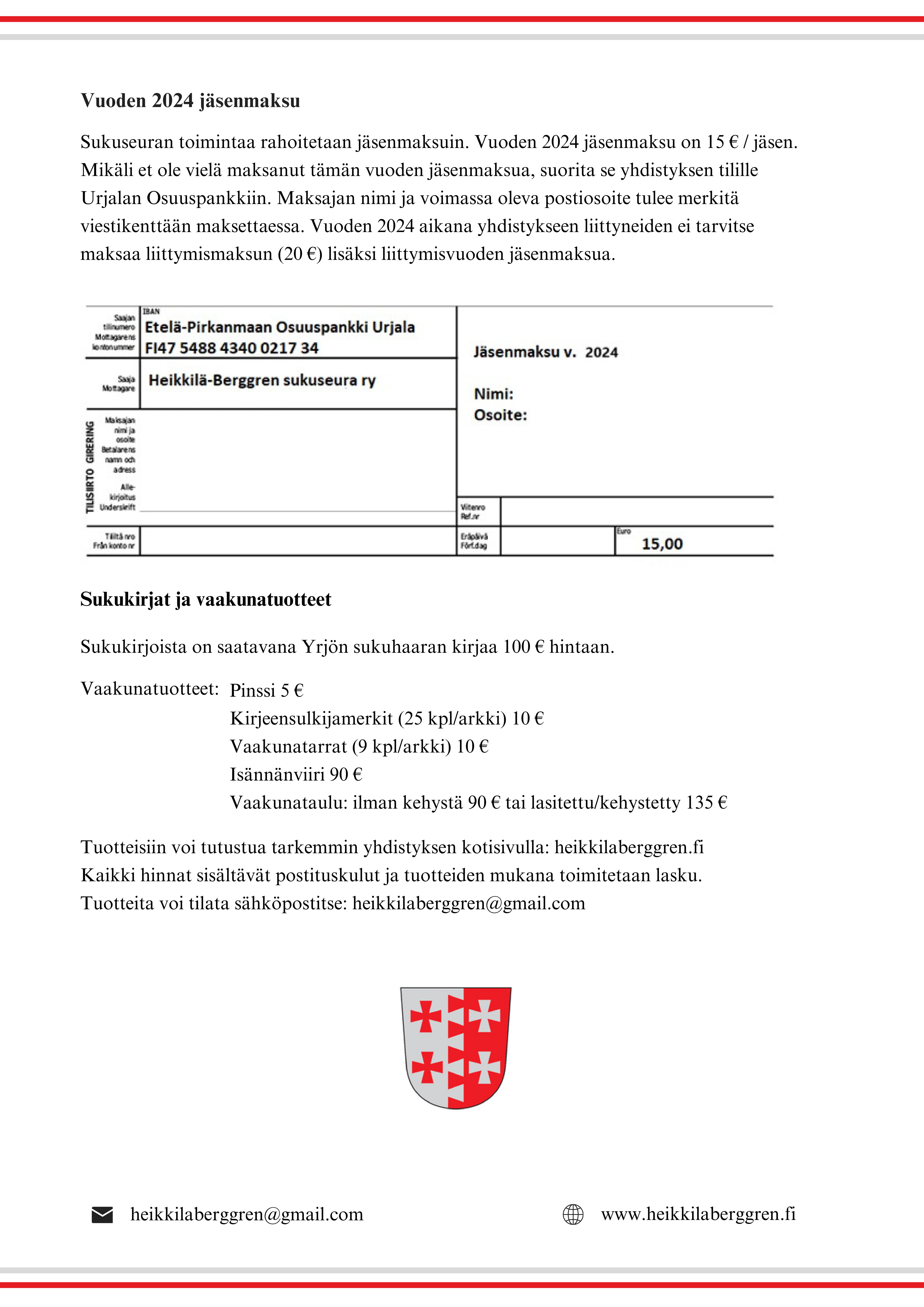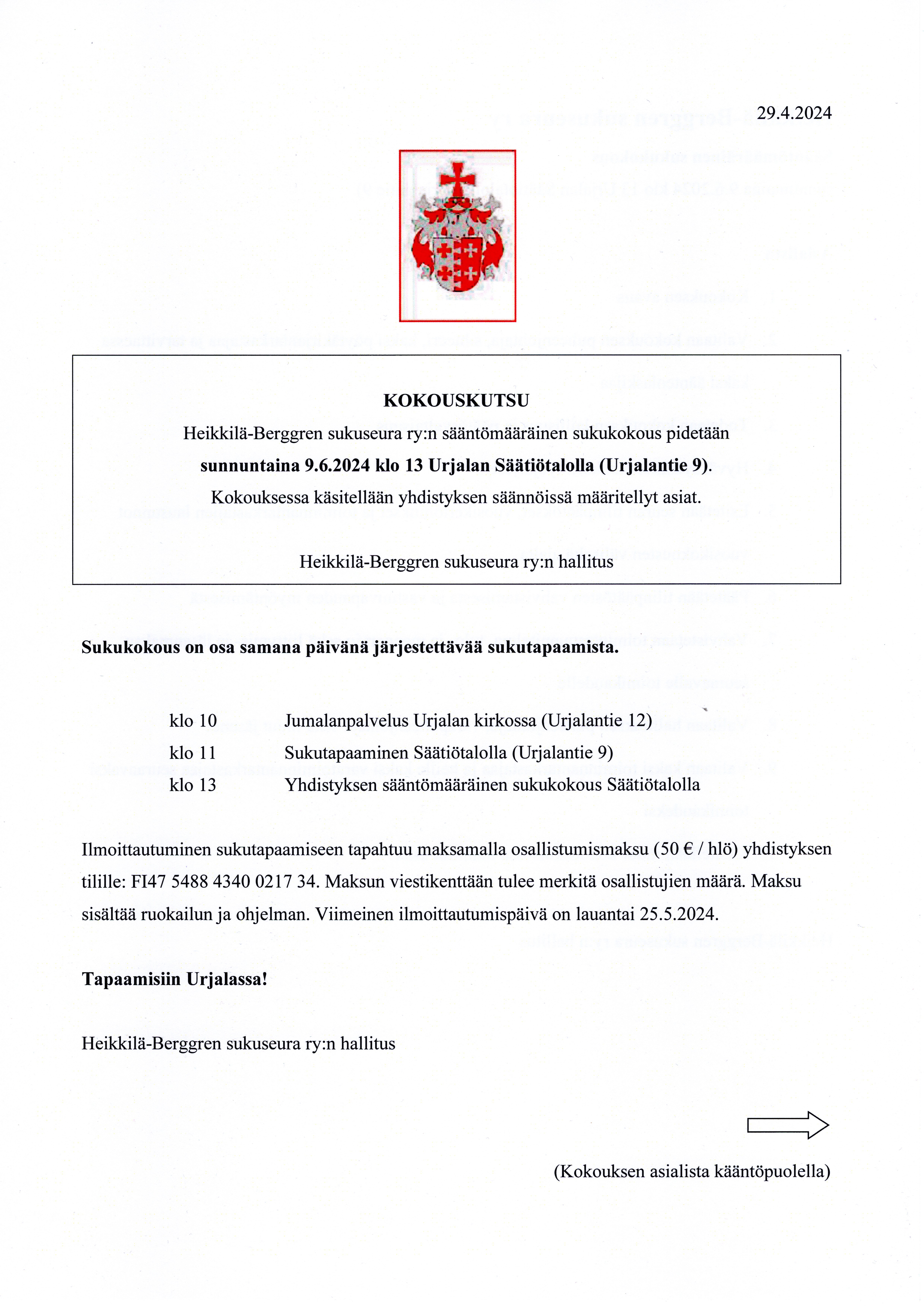 14.12.2020 Sukuseuran hallitus lähetti yhdistyksen jäsenille jäsenkirjeen. Kirje on luettavissa myös tässä: (sivu 1) ja (sivu 2). 17.6.2020 Aiemmin ilmoitetusta poiketen, sukuseura EI osallistu Pentinkulman päiville perjantaina 31.7.2020. Toivotamme kaikille sukulaisille turvallista ja aurinkoista juhannusta! 9.12.2019 Tänä vuonna sukuseuran hallitus lähetti yhdistyksen jäsenille jäsenkirjeen hieman normaalia myöhemmin pitkittyneen postilakon takia. Kirje on luettavissa myös tässä: (sivu 1) ja (sivu 2). Tänä vuonna tulee kuluneeksi 100 vuotta sukuumme kuuluvan kirjailija Väinö Linnan syntymästä. Urjalassa 26.7.–2.8.2020 järjestettävä kirjallisuustapahtuma juhlistaa kirjailijaa teemalla Elävä Linna! Myös sukuseura on edustettuna Pentinkulman päivillä Urjalan torilla perjantaina 31.7.2020. Tapaamisiin! Juhlavuoteen liittyen Väinö Linna seura kerää muistitieto kirjailijasta 17.2.-30.4.2020. Meidän suvustamme, jos jostain, tuollaisia muistoja voisi löytyä! Muisteloita voi lähettää tällä nettilomakkeella. 3.6.2019 Tule Urjalan torille! Sukuseuralla oma koju Urjalan torilla, Laukeelassa perjantaina 5.7.2019 klo 7-14. Tavataan sukulaisia ja vaihdetaan kuulumisia. Mahdollisuus myös liittyä sukuseuran jäseneksi ja ostaa vaakunatuotteita. Torilla tavataan! 29.11.2018 Sukuseuran vaakunatuotteet ovat persoonallisia ja arvokkaita joululahjoja. Tuotteisiin voi tutustua täällä. Tuotteita voi tilata sähköpostitse (heikkilaberggren(ät)gmail.com) tai hallituksen jäseniltä. Ajoissa tehdyt tilaukset ehtivät vielä mainiosti pukin konttiin! 28.11.2018 Sukuseuran hallitus lähetti yhdistyksen jäsenille jäsenkirjeen, joka on luettavissa myös tässä. 27.11.2018 Sukuseuralle etsitään sihteeriä. Tehtävät koostuvat lähinnä tiedottamisesta, jäsenrekisterin ylläpidosta, postituksista ja hallitustyöskentelyyn osallistumisesta. Tehtävästä antaa lisätietoja yhdstyksen puheenjohtaja Nina Kivivirta (heikkilaberggren(ät)gmail.com). 13.10.2018 Sukuseuran uusi hallitus piti järjestäytymiskokouksensa 13.10.2018 Humppilassa. Hallituksen valitsemana toimihenkilönä lupautui jatkamaan rahastonhoitaja Kaija Lahtola-Kukila. 10.6.2018 Sukutapaaminen ja yhdistyksen vuosikokous Urjalan yhtenäiskoululla. Juhlan teemana oli suvun tutkiminen ja juhlan kohokohtana Yrjön sukuhaaran kirjan uudistetun painoksen julkaiseminen. Vuosikokous valitsi yhdistykselle uuden hallituksen sekä kutsui yhdistyksen kolmanneksi kunniajäseneksi yhdistyksen pitkäaikaisen puheenjohtajan Tapio Berggrenin. 1.5.2018 Kokouskutsu Heikkilä-Berggren sukuseura ry:n sääntömääräinen sukukokous sunnuntaina 10.6.2018 klo 14.30 Urjalan Yhtenäiskoululla (Urjalantie 37). Kokouksessa käsitellään sääntömääräiset asiat. 30.4.2018 Yrjön sukuhaaran uunituoretta, päivitettyä kirjaa voi tilata ennakkoon sähköpostitse: heikkilaberggren(ät)gmail.com. Toimitukset kesäkuussa. 30.4.2018 Sukuseuran hallitus lähetti yhdistyksen jäsenille jäsenkirjeen, joka on luettavissa myös tässä. 16.11.2017 Seuraava sukutapaaminen ja yhdistyksen sukukokous pidetään sunnuntaina 10.6.2018 Urjalan Yhtenäiskoululla. Juhlan yhteydessä on myytävänä uutta, päivitettyä Yrjön sukuhaaran kirjaa. Tervetuloa! 16.11.2017 Sukuseuran hallitus lähetti yhdistyksen jäsenille jäsenkirjeen, joka on luettavissa myös tässä. 17.6.2017 Tervetuloa tapaamaan Heikkilä-Berggren sukua ja hallituksen jäseniä Urjalan torille Laukeelaan perjantaina 30.6. Tori on avoinna klo 7-14. Sukuseuran kojulla voi päivittää tietoja sukukirjoihin sekä kuulla viimeisimmät uutiset kirjojen uusintapainoksiin liittyen. Ennakkotietoa myös kesän 2018 sukutapaamisesta Urjalassa. Myynnissä on suvun vaakunatuotteita kesähinnoin: viirejä, tauluja kehyksillä ja ilman, kirjeensulkijamerkkejä sekä tarroja. Kaikki oivia lahjoja kesän juhliin! Tapaamisiin Urjalassa! 15.11.2016 Sukuseuran hallitus lähetti yhdistyksen jäsenille jäsenkirjeen, joka on luettavissa myös tässä. 8.10.2015 Sukuseuran hallituksen kokouksessa päätettiin, että sukukirjojen päivitystyö annetaan yhdistyksen 1. kunniajäsenen sukututkija Yrjö Salon tehtäväksi. Hän aloittaa päivitystyön Yrjön sukuhaaran kirjasta. Myös muiden sukuhaarojen kirjat tullaan päivittämään. Yhdistyksen hallitus sekä yhdistyksen 2. kunniajäsen Hirvo Salonen toimivat Yrjön Salon apuna toimitustyössä. Tietoja päivityksiä varten voi lähettää suoraan Yrjö Salolle (saloyr(at)gmail.com). 30.11.2015 Sukuseuran hallitus lähetti yhdistyksen jäsenille jäsenkirjeen, joka on luettavissa myös tässä. 21.11.2015 Sukuseuran uusi hallitus piti järjestäytymiskokouksensa 21.11.2015 Urjalassa. Kokouksen asialistalla oli mm. yhdistyksen sääntömuutos. Kesällä vuosikokous hyväksyi uudet säännöt yhdistyksen voimassa olevien sääntöjen mukaisesti ja hallitus hakee vahvistuksen sääntömuutokselle vielä kuluvana vuonna Patentti- ja rekisterihallitukselta. 7.6.2015 Sukutapaaminen ja yhdistyksen vuosikokous Urjalan Säätiötalolla. Juhlaa vietettiin sukuumme kuuluvan Väinö Linnan 95-vuotismerkkipäivän hengessä. Vuosikokous valitsi yhdistykselle uuden hallituksen ja hyväksyi yhdistyksen sääntömuutoksen. Yhdistyksen kunniajäseneksi valittiin Hirvo Salonen hänen pitkän ja aktiivisen hallitusuransa ansiosta.