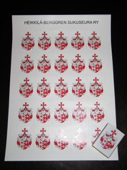 Vaakunatarrat Tarrat toimitetaan A4-kokoisena arkkina, jossa on 9 tarraa. Tarrat on painettu kotimaassa. Yksi tarra on kooltaan n. 6x8 cm. Arkin hinta: 10 euroa Merkkiarkkeja voi tilata ja tiedustella sähköpostitse (heikkilaberggren(ät)gmail.com) tai hallituksen jäseniltä.